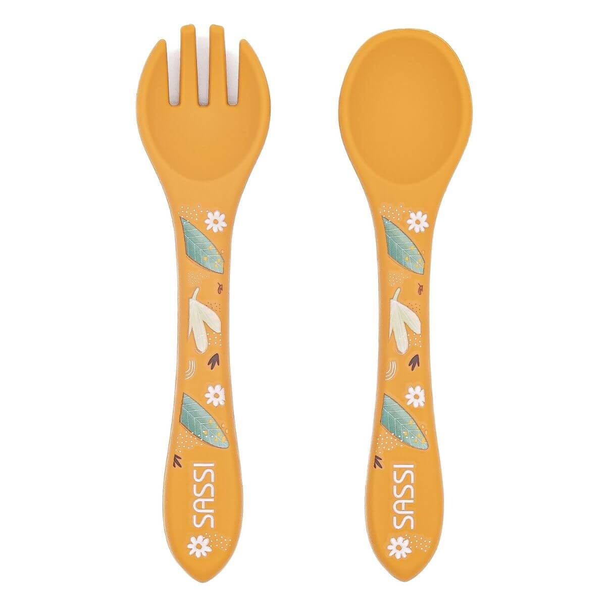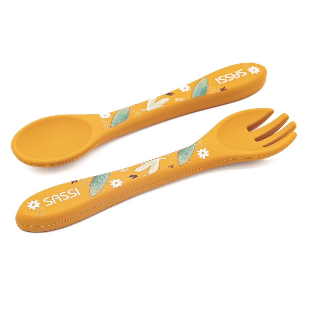 Set de coberts de silicona amb forma arrodonida per menjar amb seguretat.