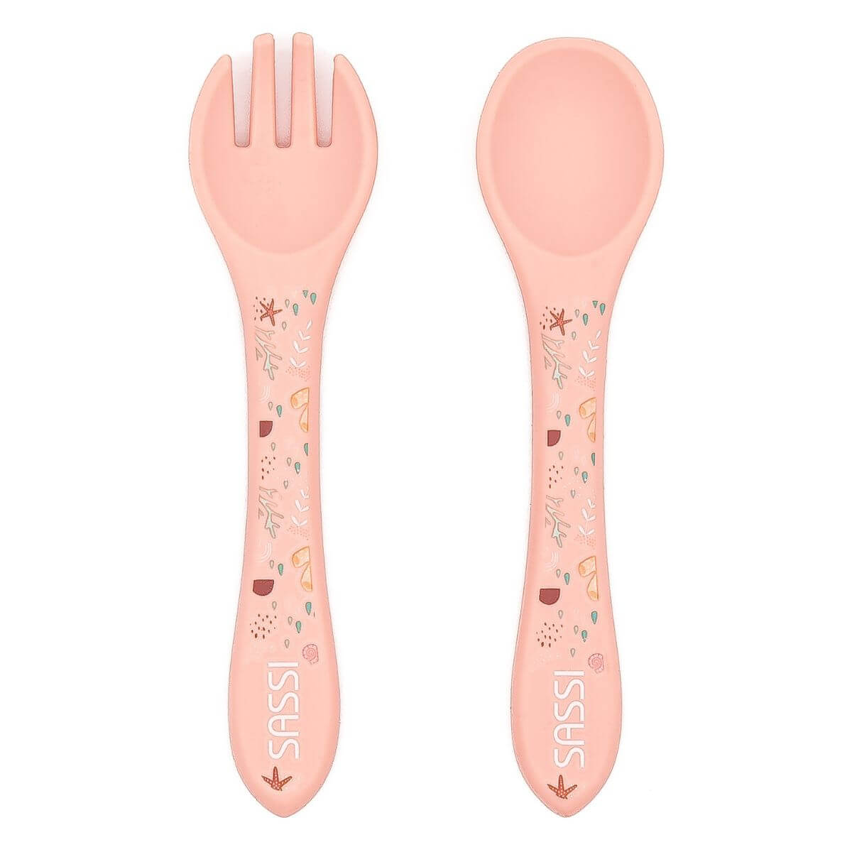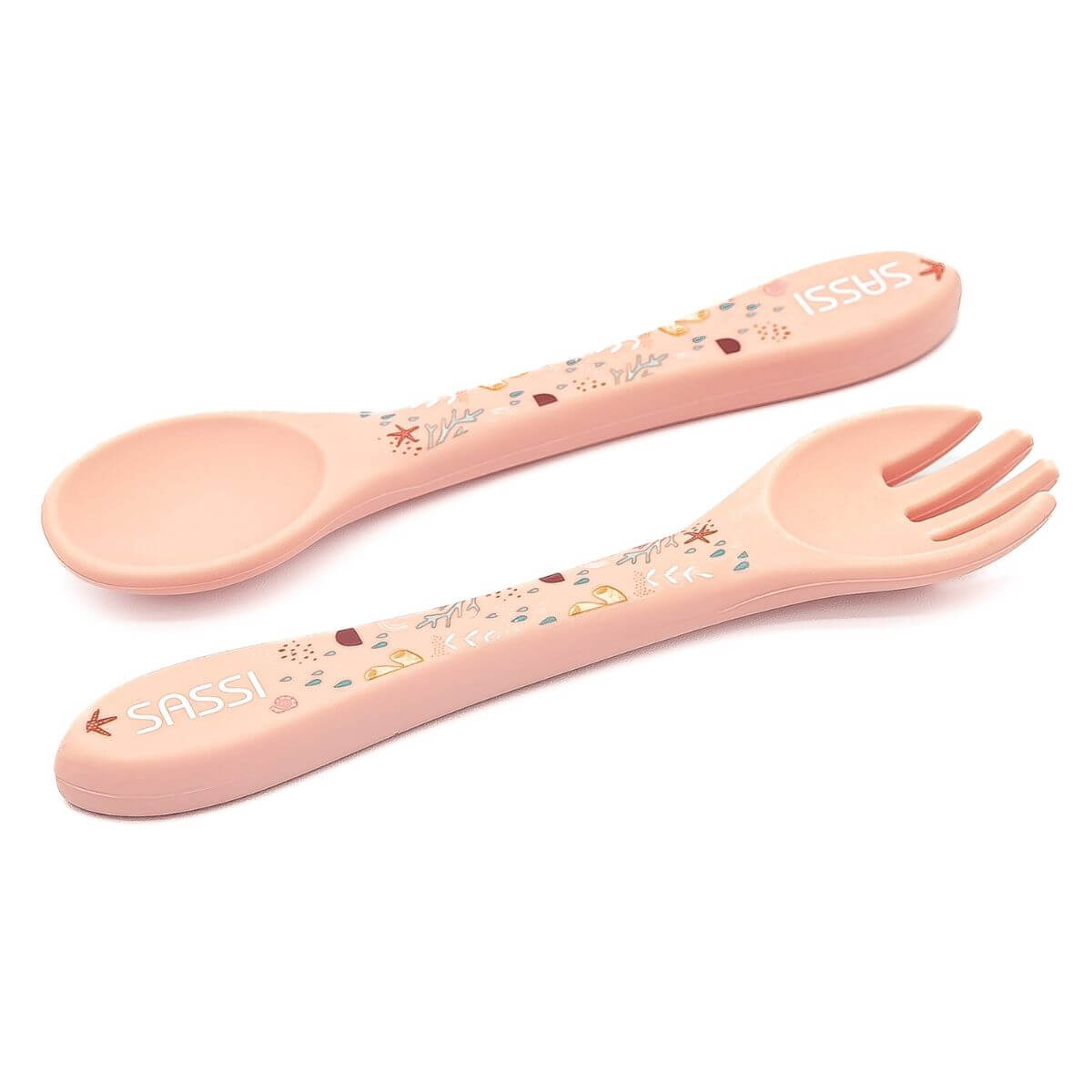 Set de coberts de silicona amb forma arrodonida per menjar amb seguretat.