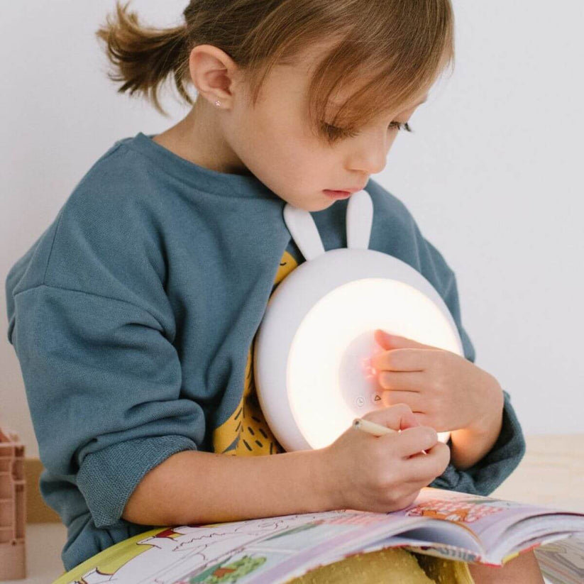 Despertador-llum amb orelles de conillet que acompanya els ritmes de son i vigília: il·lumina progressivament abans de l'alarma (efecte sortida del sol), emet sons naturals i permet programar posta de sol per disminuir intensitat.
