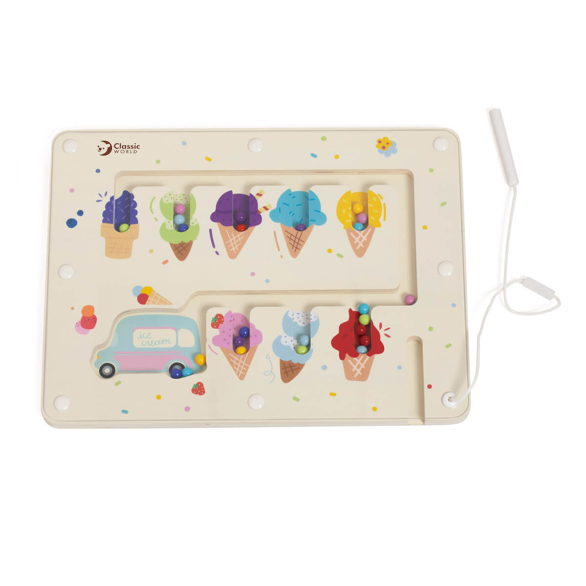 Un joc magnètic per col·locar boles de gelat al seu con corresponent. Ideal per desenvolupar la motricitat fina, la concentració i el reconeixement de colors. El seu format compacte el fa perfecte per jugar a casa o portar de viatge.