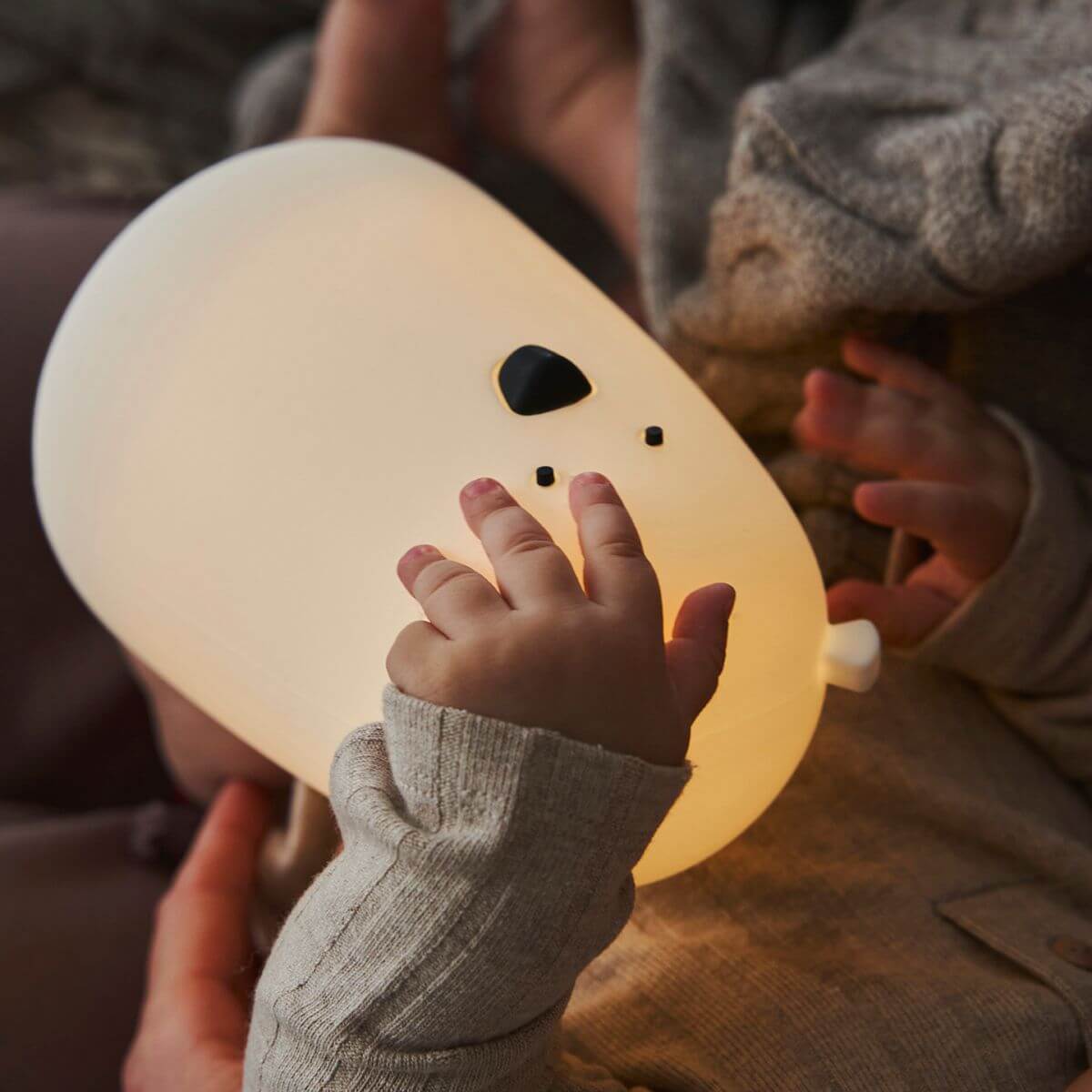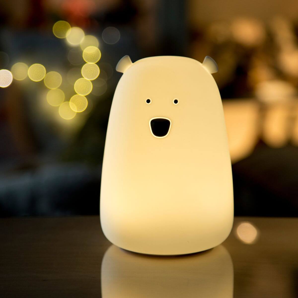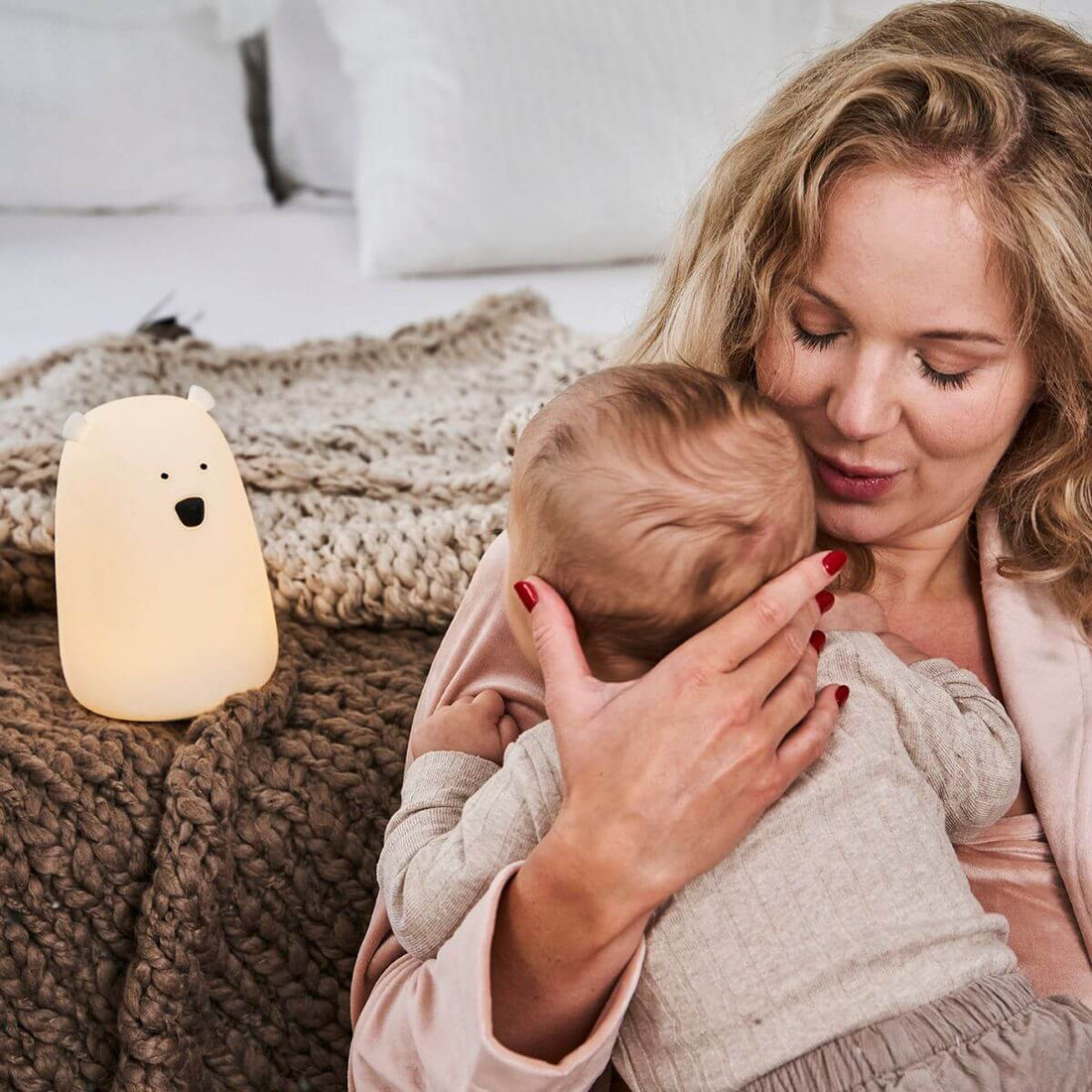 Llum de silicona en forma d'ós blanc, suau i segura, que canvia de color amb suaus tocs i ofereix apagat automàtic. Ideal per acompanyar el descans del nadó i facilitar les tasques nocturnes amb una llum càlida i que no enlluerna.