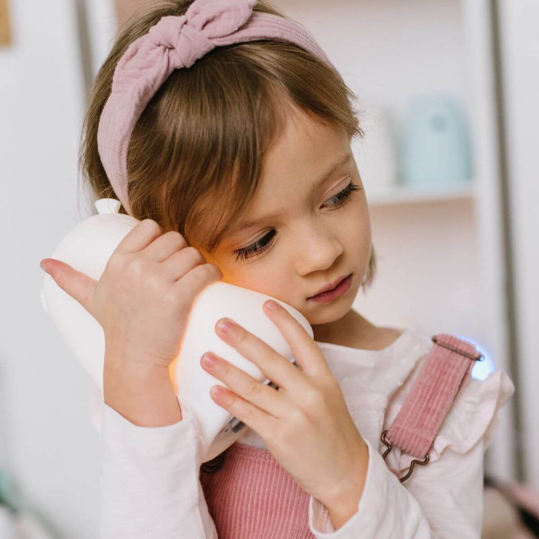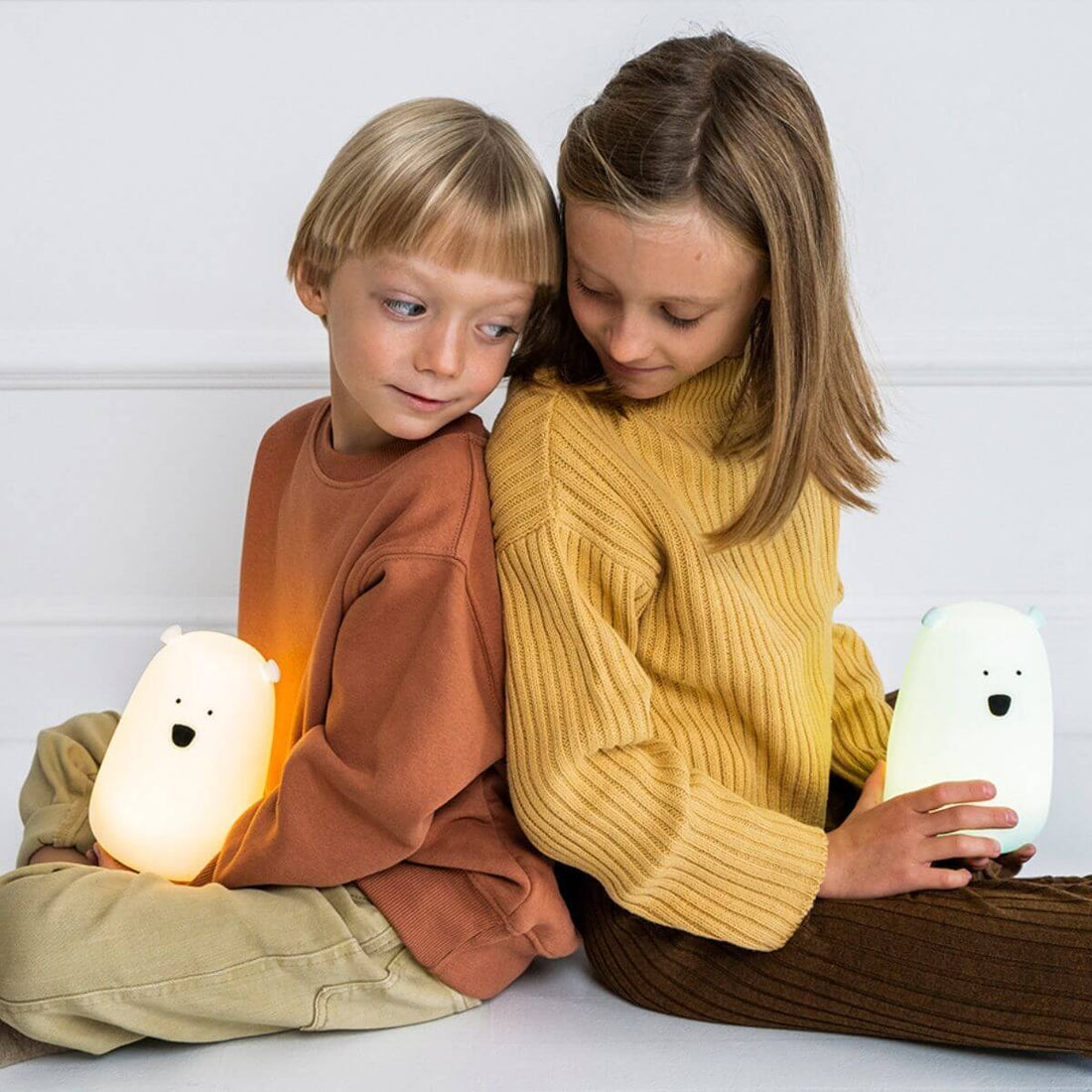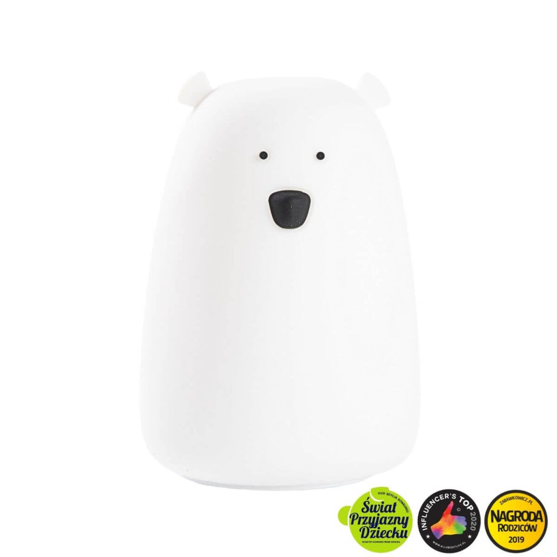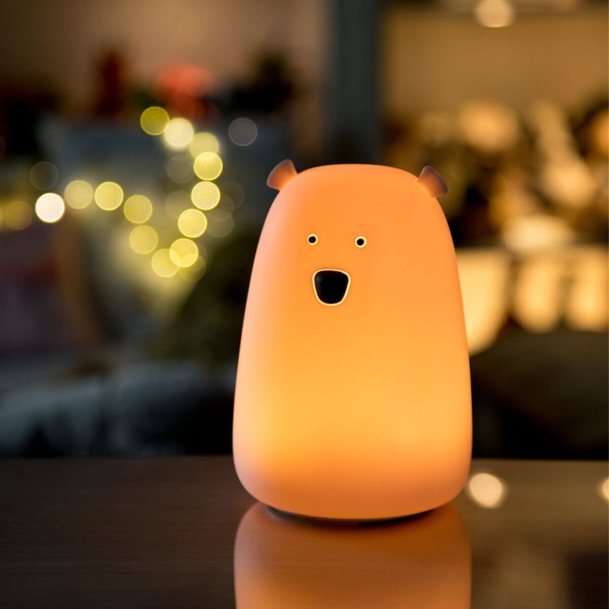 Llum de silicona en forma d'ós blanc, suau i segura, que canvia de color amb suaus tocs i ofereix apagat automàtic. Ideal per acompanyar el descans del nadó i facilitar les tasques nocturnes amb una llum càlida i que no enlluerna.