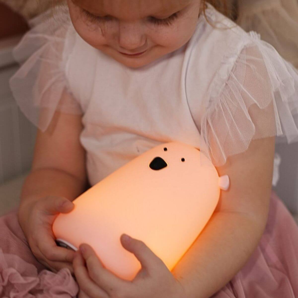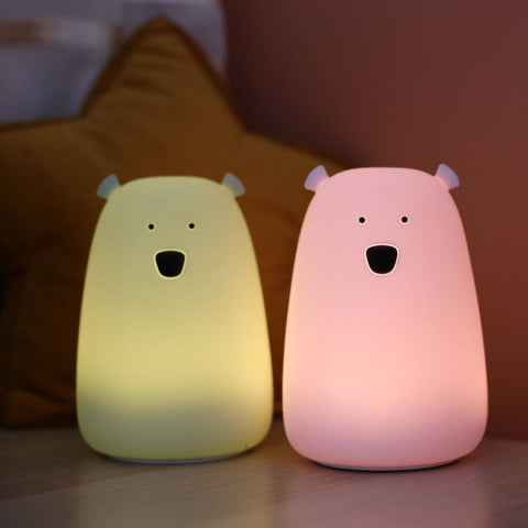 Llum de silicona en forma d'ós de color lavanda, lliure de BPA, que emet una llum relaxant i canvia de color amb tocs suaus. Inclou apagat automàtic i càrrega USB tipus C; dissenyada per aportar calma i seguretat a l'entorn del nadó i facilitar les rutines nocturnes.