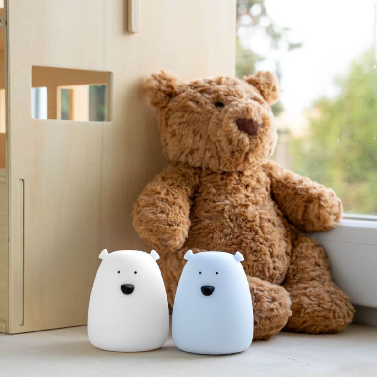 Set de 2 mini llums de silicona en colors blanc i blau àrtic. Versió mini dels llums d'ós de la marca Rabbit & Friends. El llum blanc ofereix canvi de color i llum càlida relaxant; la blava proporciona una brillantor agradable. Es carreguen per USB-C, incorporen apagat automàtic i són fàcils de transportar, perfectes per a viatges i dormir fora de casa.