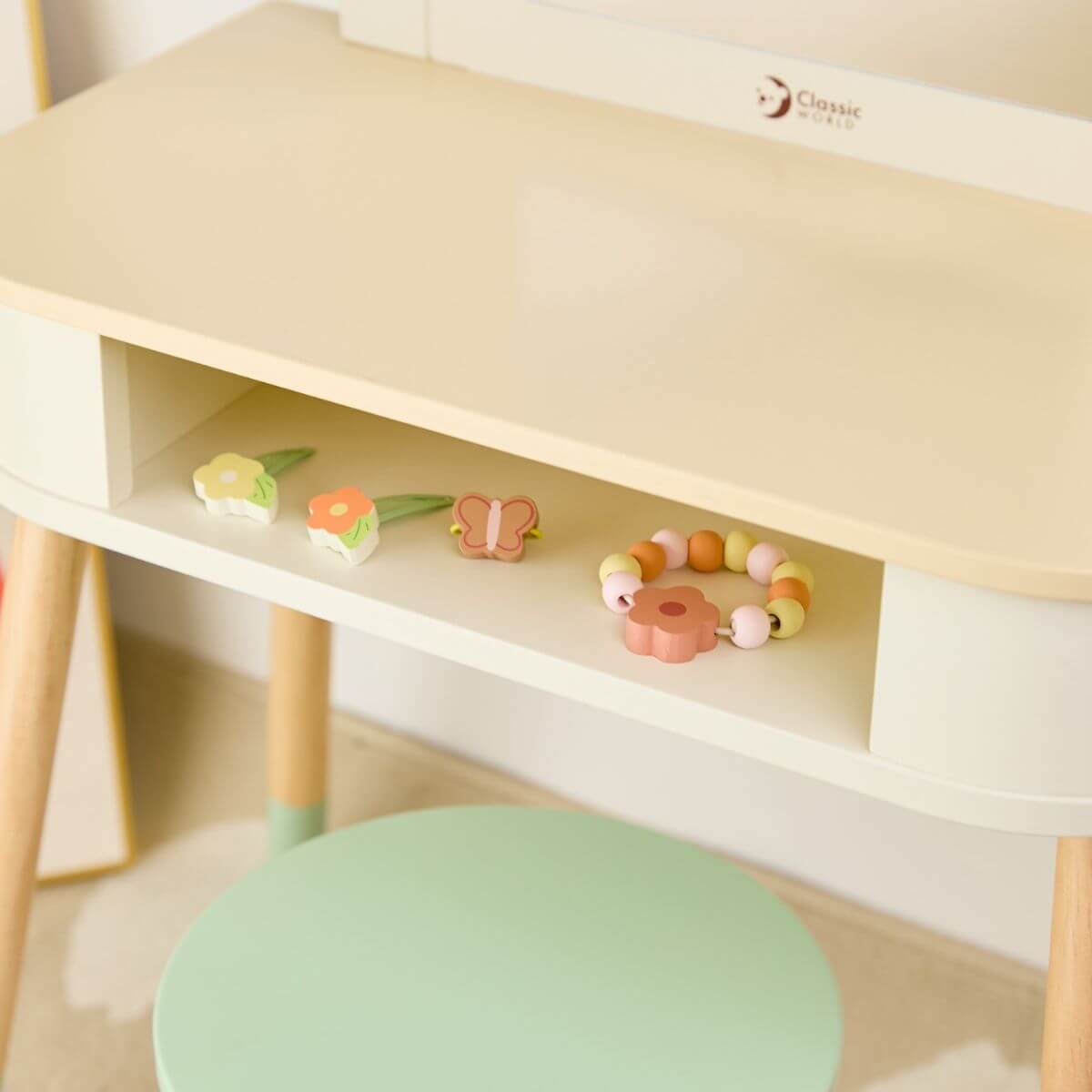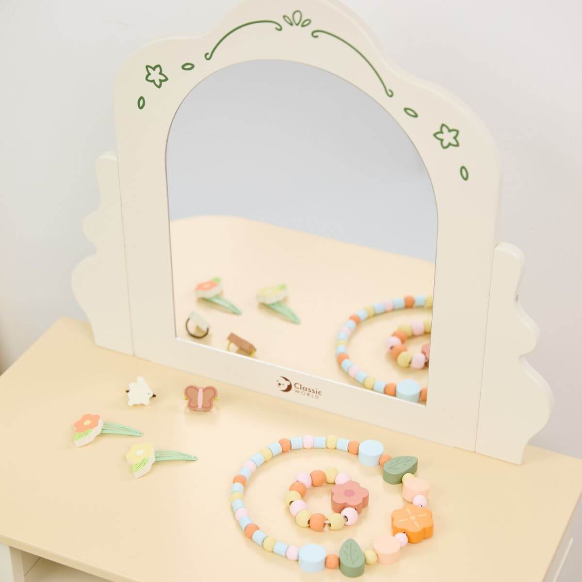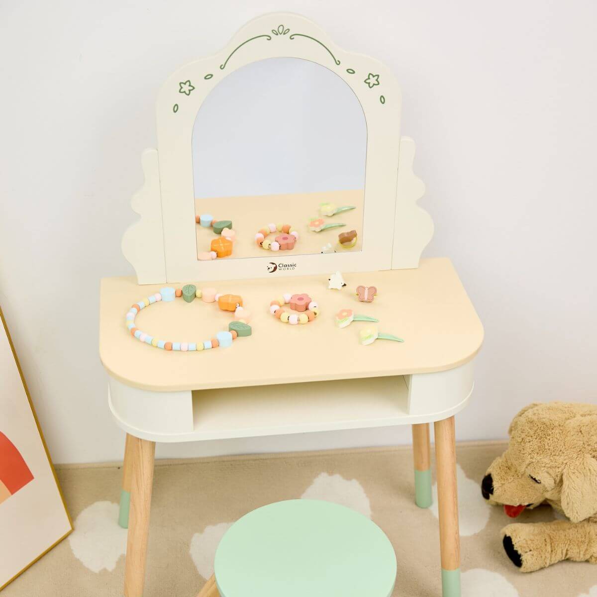 Un preciós tocador de fusta amb mirall segur, banc i accessoris inclosos. Ideal per al joc simbòlic, fomenta l’autoestima, el llenguatge i l’autonomia mentre nens i nenes imiten rutines quotidianes amb tendresa.