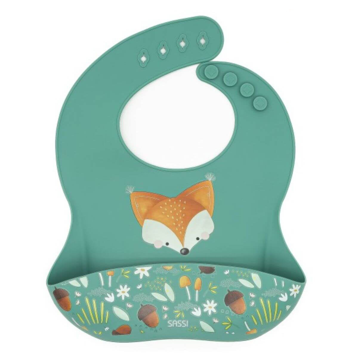 Este babero tiene como protagonista a Crunchy, el zorro de la colección SASSI, donde cada animal tiene su propia historia, pensada para acompañar a los peques en su día a día.