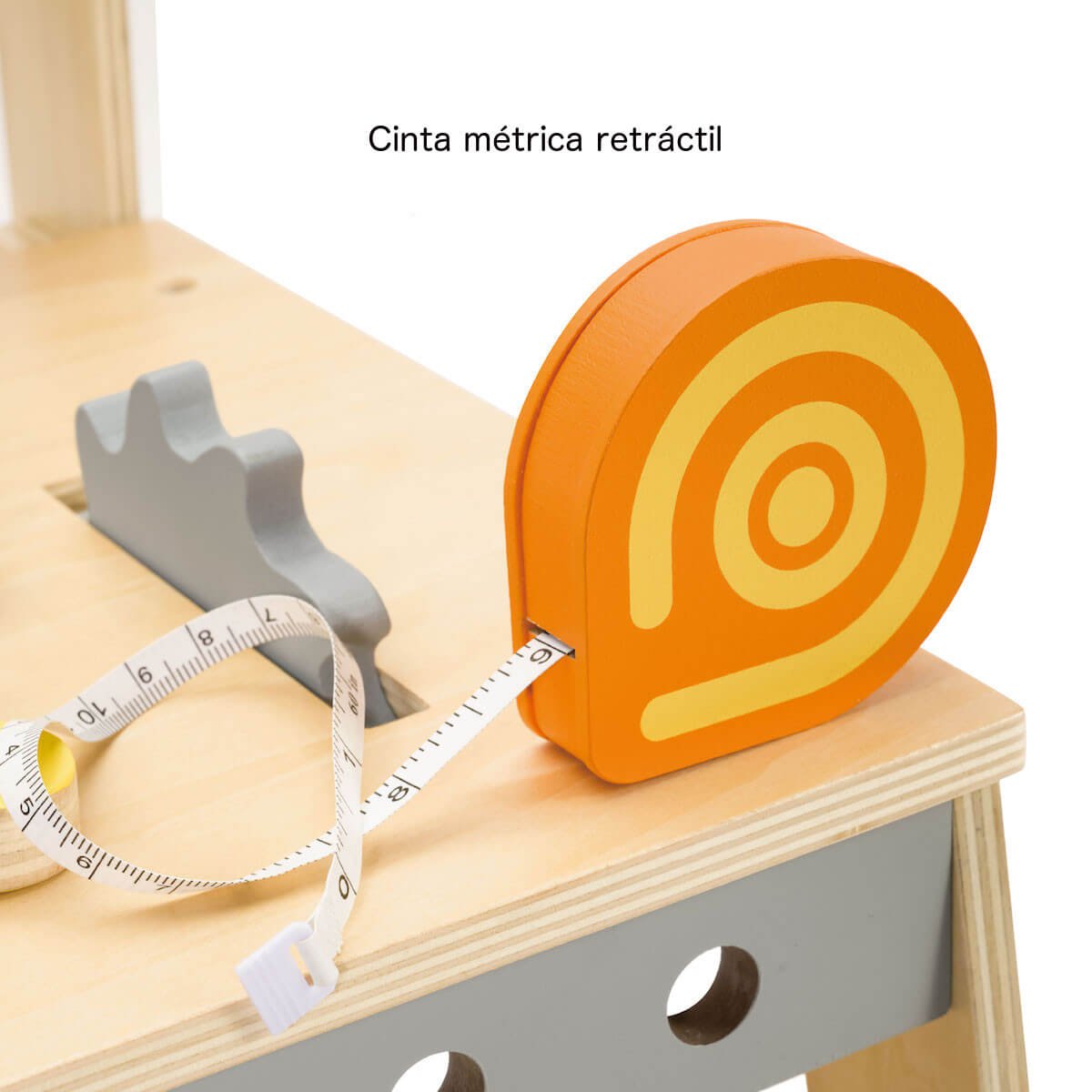 Un banco de carpintero con herramientas que no suelen estar en los bancos de juguete: cinta métrica retráctil funcional y pie de rey. Un juguete que no parece de juguete.