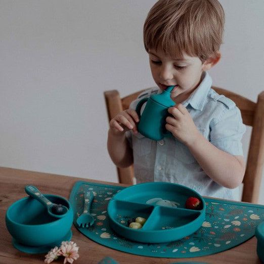 - BLW y alimentación complementaria: las paredes altas son especialmente útiles cuando tu hijo/a empieza con trozos y necesita espacio para manipular la comida. La silicona flexible amortigua los golpes si lo arrastra o lo empuja.