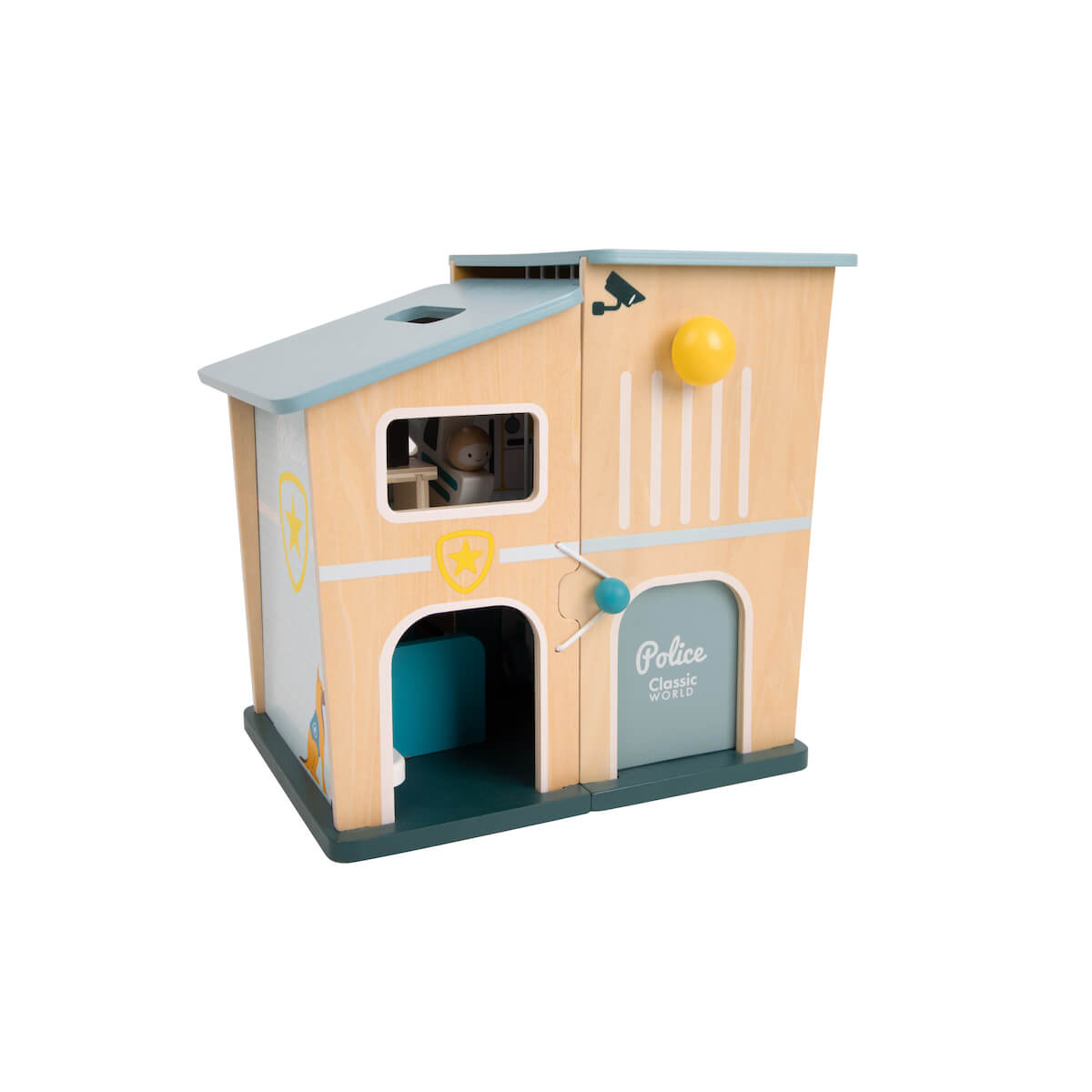 Comisaría de policía de madera diseñada para el juego simbólico y la creación de historias. Incluye dos vehículos, agentes, zona de recepción, sala de detectives y una pequeña cárcel; permite organizar escenas que fortalecen la comprensión de roles y las habilidades sociales.