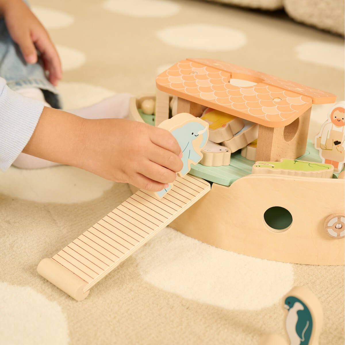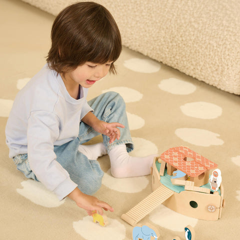Un set para construir el Arca de Noé que combina construcción, juego imaginativo y equilibrio. Todas las piezas encajan fácilmente y el propio arca funciona como superficie para el juego de equilibrio; incluye parejas de animales que enriquecen el cuento y la clasificación por parejas.