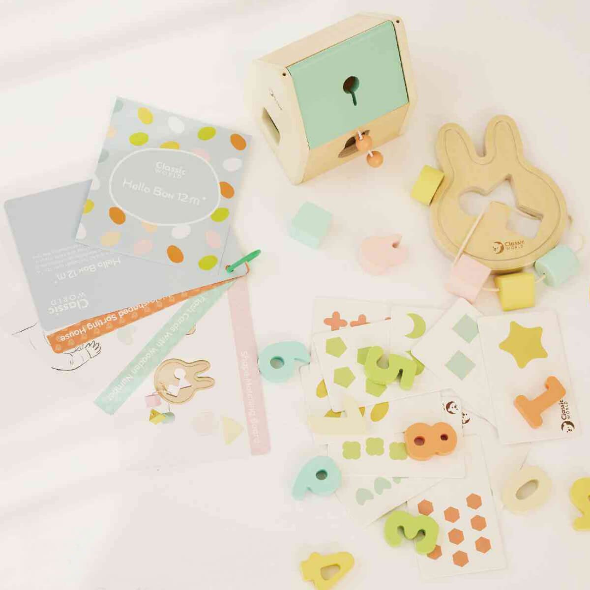 Hello Box 12 meses propone nuevos retos con un encajable de formas, un sonajero y un juego de números para introducir nociones matemáticas y combinaciones de forma mediante el juego. Pensado para acompañar la transición al juego con dos manos.