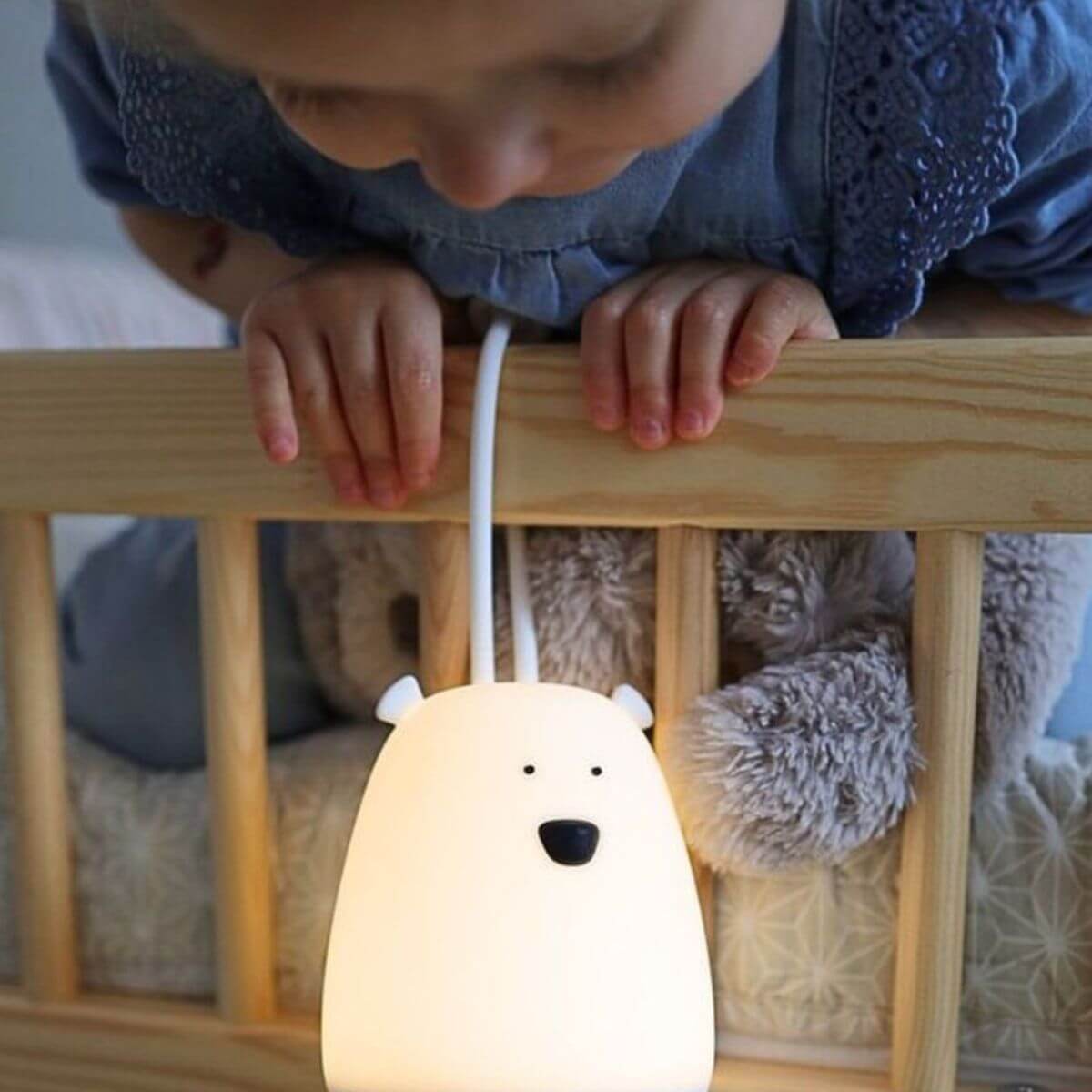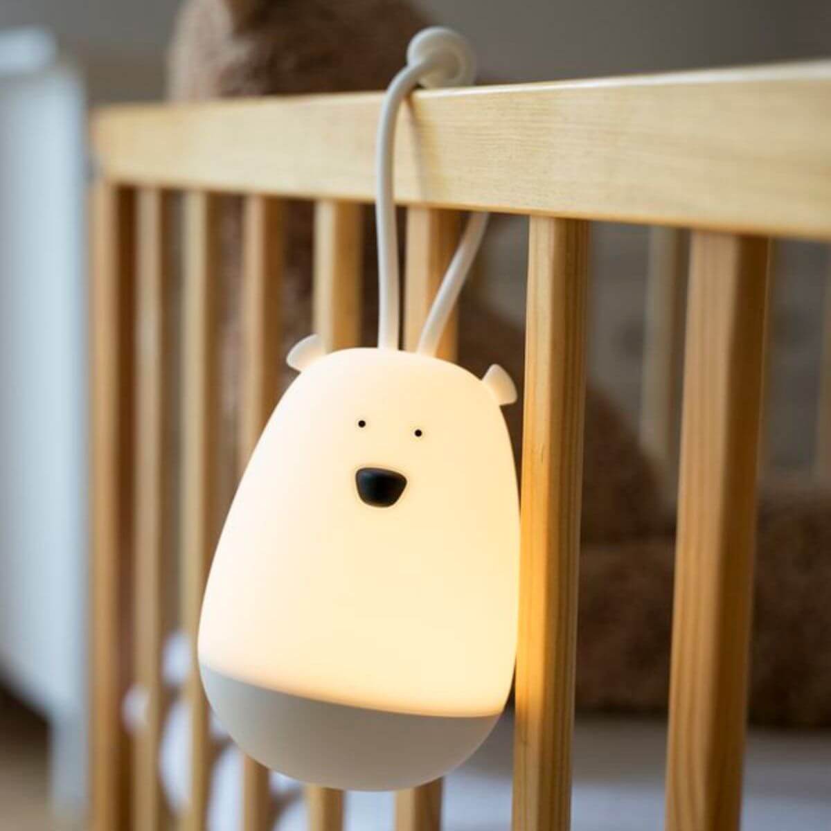 Lámpara de silicona en forma de oso blanco, suave al tacto y libre de BPA, pensada para crear una luz cálida y segura en la habitación del bebé. Se puede colgar gracias a su cierre de silicona; incluye control remoto para ajustar intensidad y colores, función de apagado automático y carga por USB tipo C. Acompaña el descanso nocturno sin deslumbrar y facilita las rutinas de cuidado nocturno.