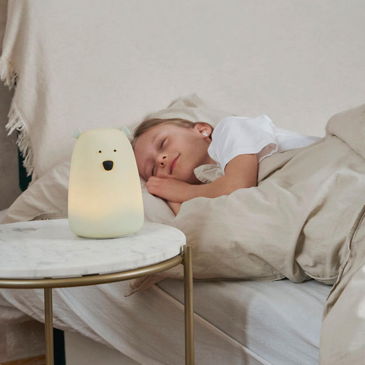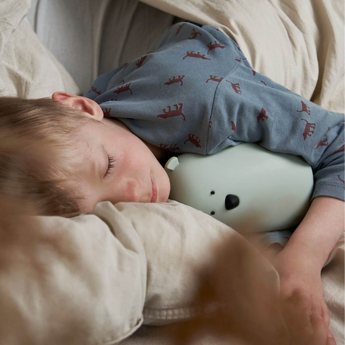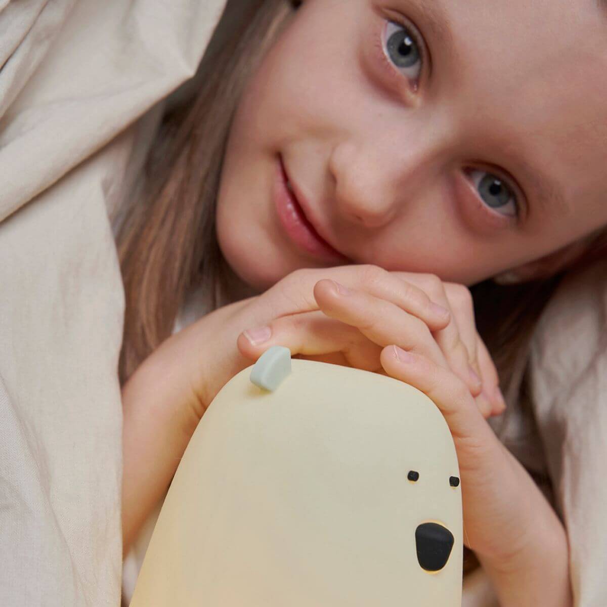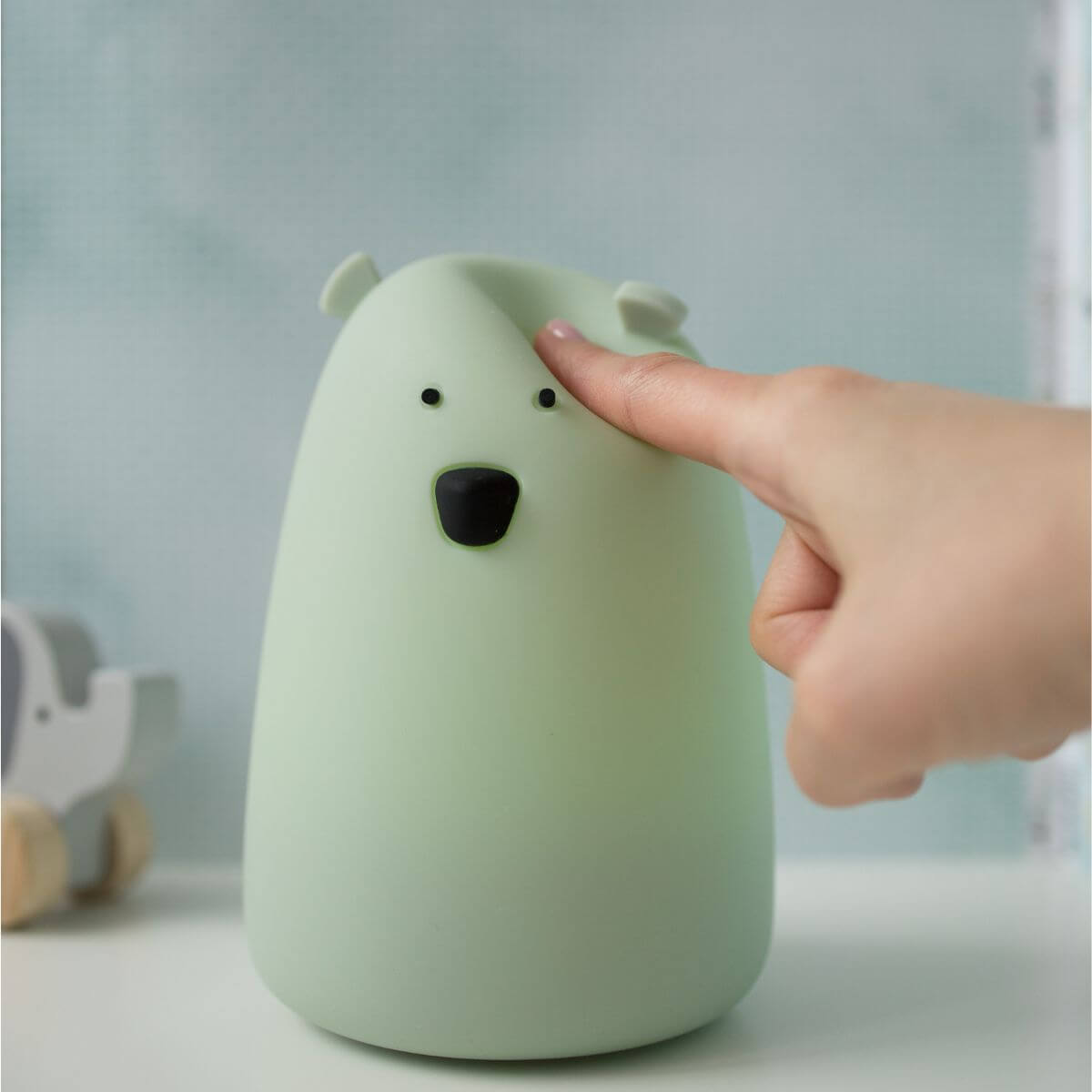 Lámpara de silicona en forma de oso de color verde salvia, libre de BPA y agradable al tacto. Emite una luz cálida fija que se regula con toques sucesivos; incluye apagado automático tras 2 horas y carga por USB tipo C. No se calienta y es fácil de limpiar, pensada para acompañar el descanso y generar sensación de seguridad.