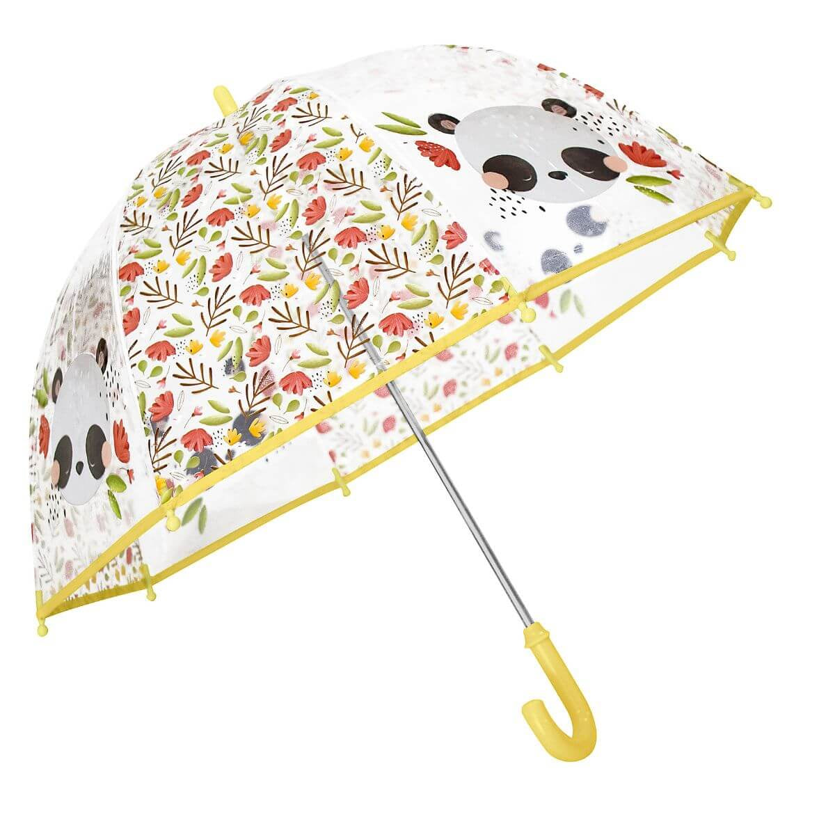 Paraguas infantil transparente con mango ergonómico fácil de agarrar para manos pequeñas. Tu peque lo lleva solo — y puede ver perfectamente por donde camina. Con Gnummy el oso panda de la colección SASSI.