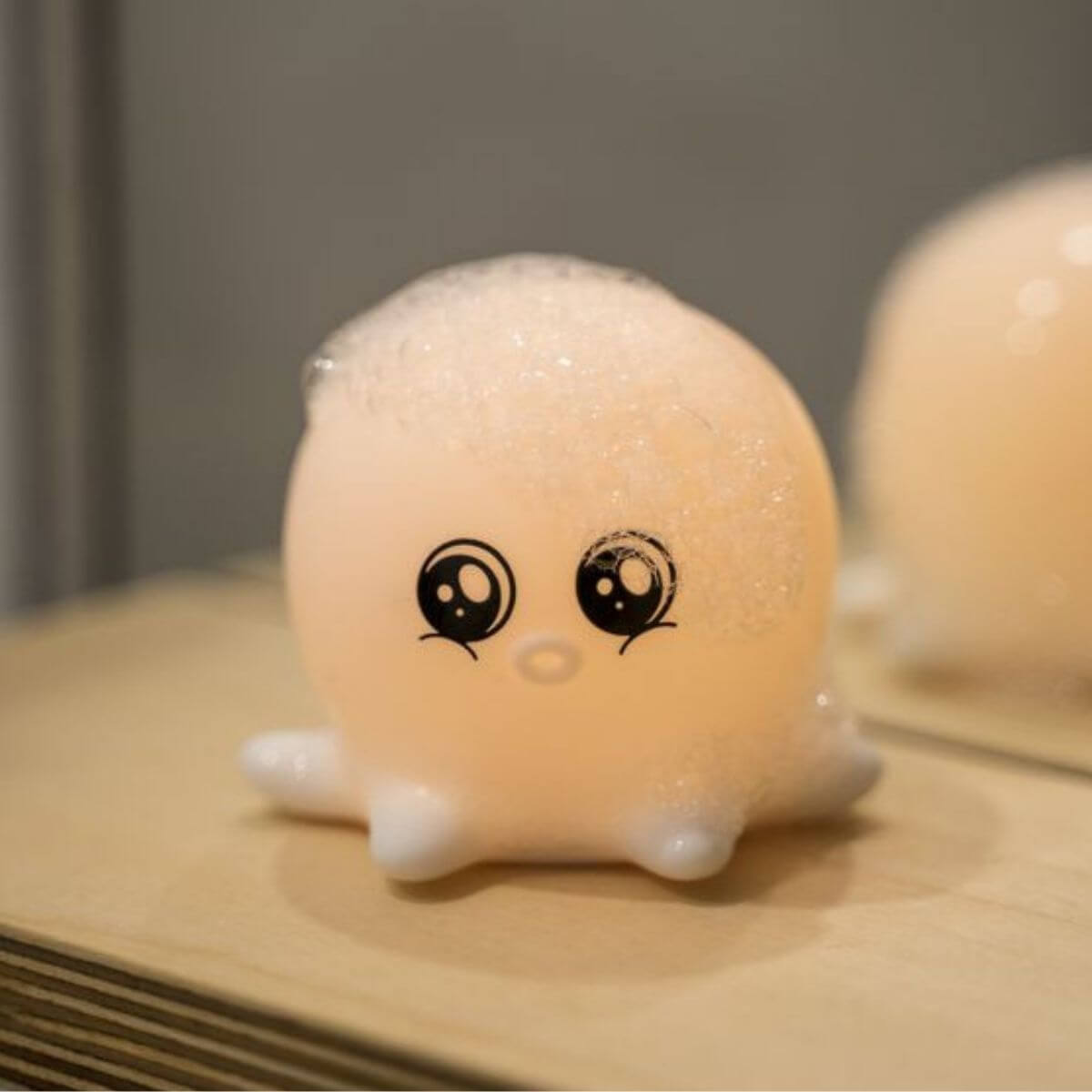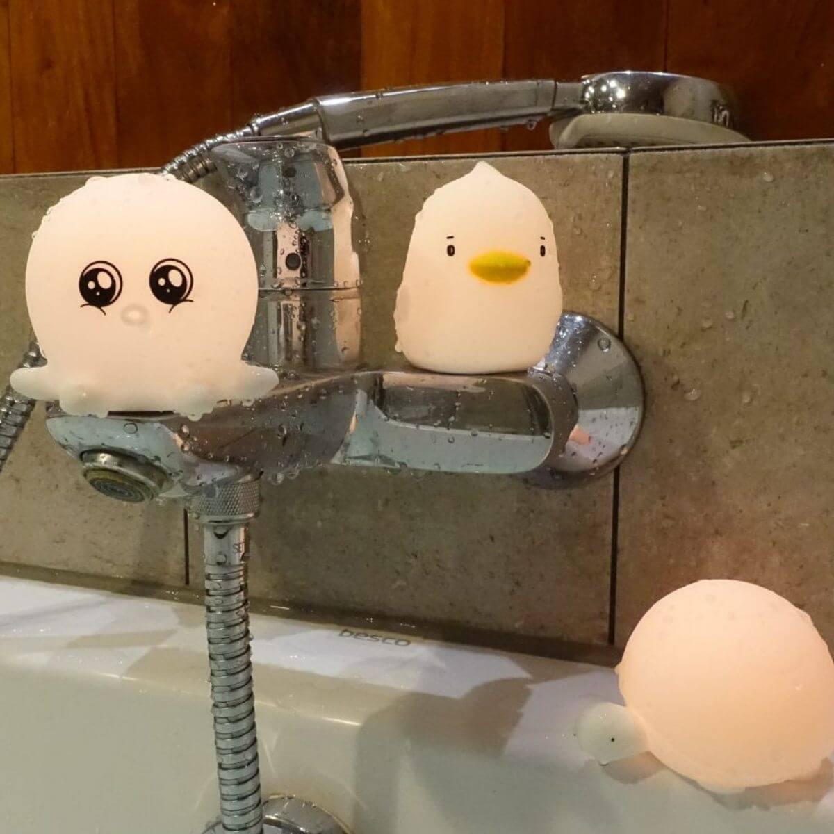 Tres mini lámparas acuáticas en silicona libre de BPA para jugar y acompañar el baño. Flotan, son resistentes al agua y cambian de color al tocar su superficie; emiten 1 minuto de luz blanca al activarse y se apagan automáticamente tras 1 minuto de inactividad. Favorecen la exploración sensorial, el juego autónomo y la confianza en el agua.