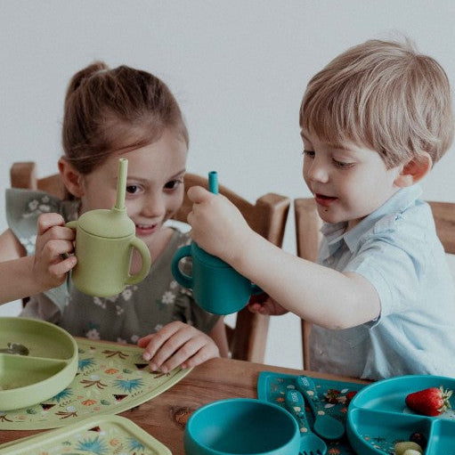 Aprender a beber solo es un proceso que lleva tiempo — y durante ese proceso los derrames son inevitables. Esta taza está pensada para reducirlos: la tapa hermética cierra bien, la pajita facilita que tu peque controle el flujo y las asas le dan el agarre que necesita a partir de los 6 meses. Todo en silicona suave de la más alta calidad.