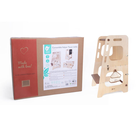 Torre de aprendizaje convertible de inspiración Montessori que acompaña la autonomía y la participación en la vida diaria. Se transforma fácilmente en mesa y silla, permitiendo que niños y niñas se acerquen a la cocina, al lavabo o a proyectos creativos con seguridad.